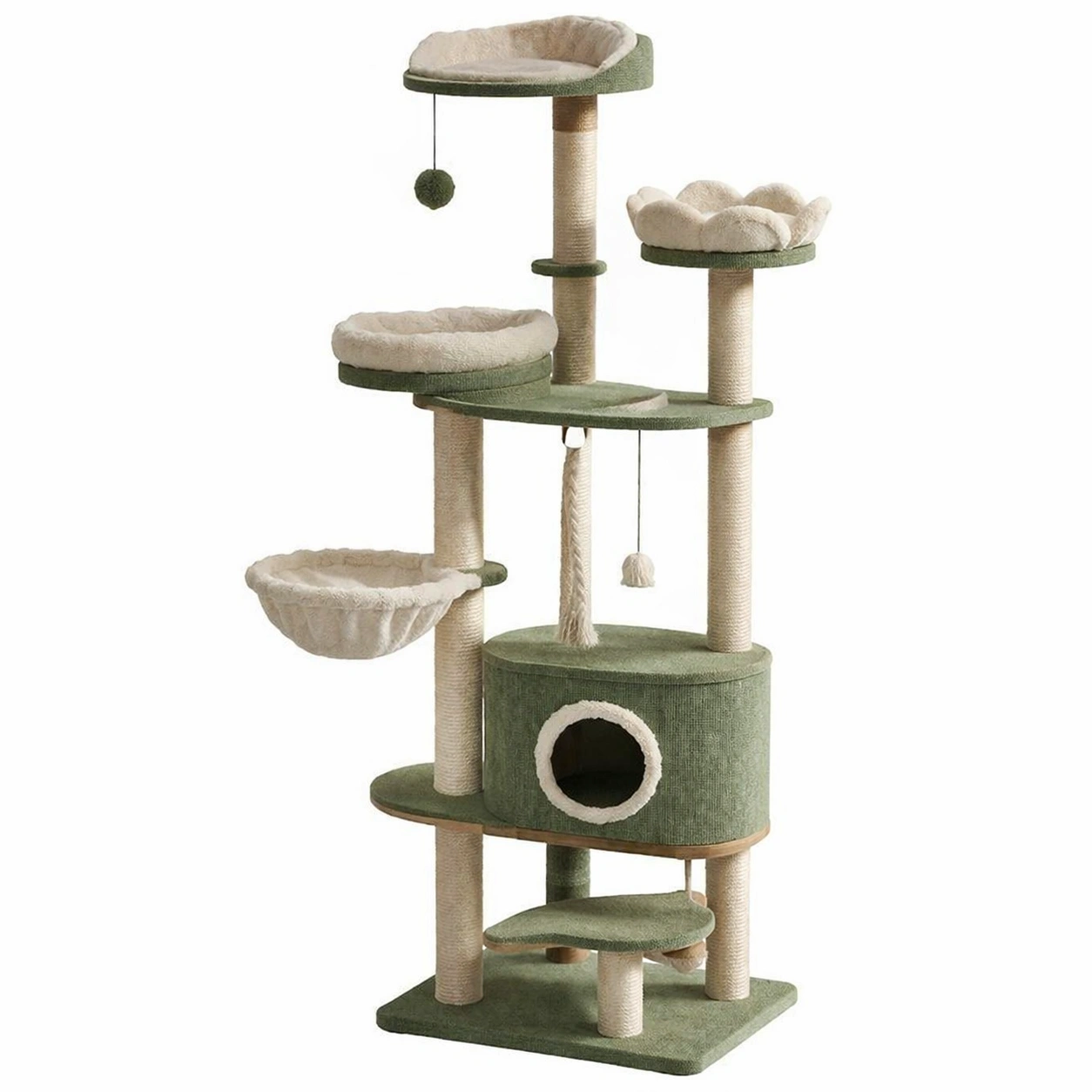 Árbol para gatos con plataformas y juguetes de MDF y sisal gris