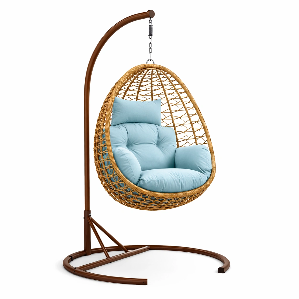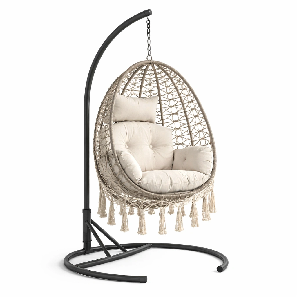 Silla colgante de resina sintética con cojines beige y soporte de acero