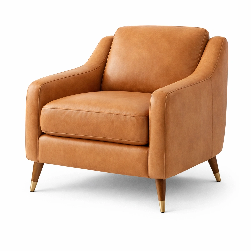 El sillón cuenta con una estructura de madera maciza y está tapizado en cuero sintético. Las patas son de madera con detalles metálicos. Las dimensiones del sillón son 78 cm de ancho, 80 cm de profundidad y 85 cm de altura. Puede soportar hasta 120 kg.