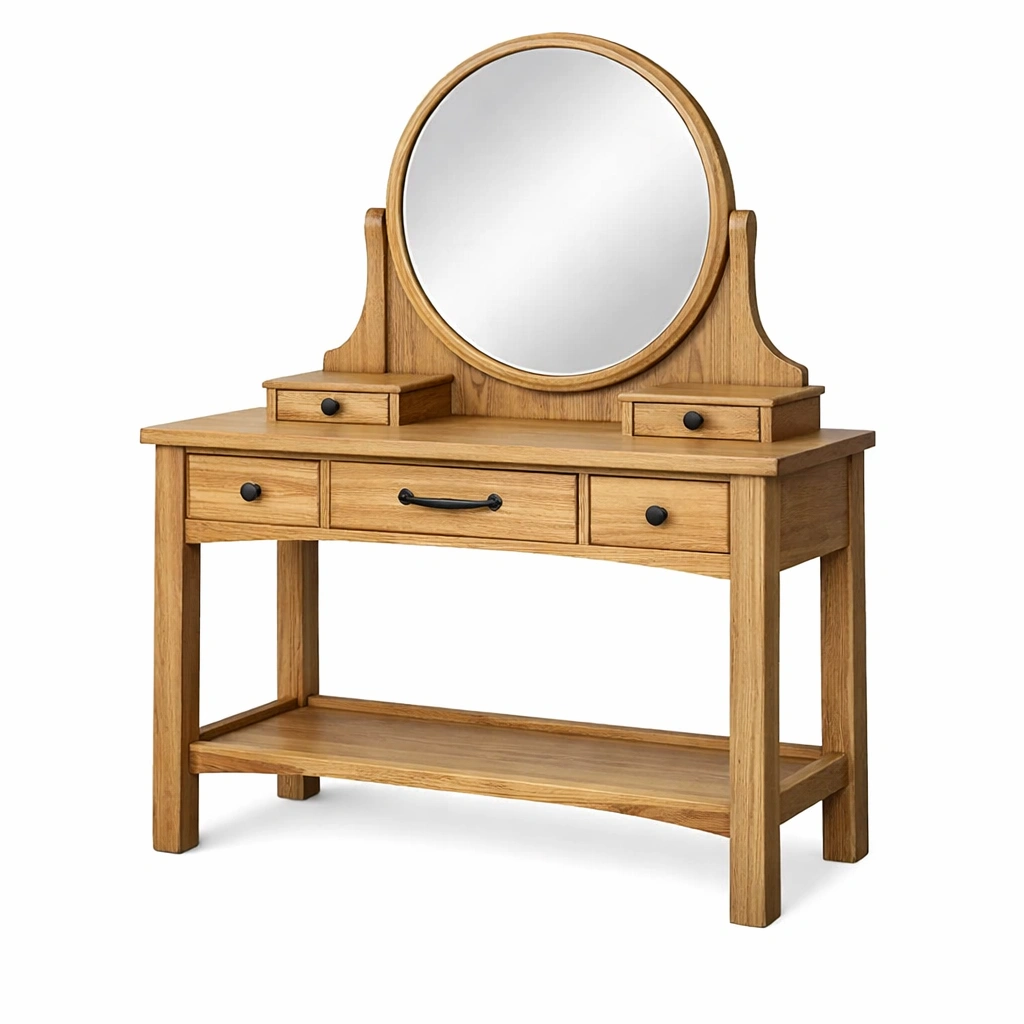 Este tocador está fabricado en madera maciza de roble con un acabado de barniz transparente. El color es Roble Claro y sus dimensiones son 120 cm de largo, 50 cm de ancho y 140 cm de alto. Pesa 25 kg.